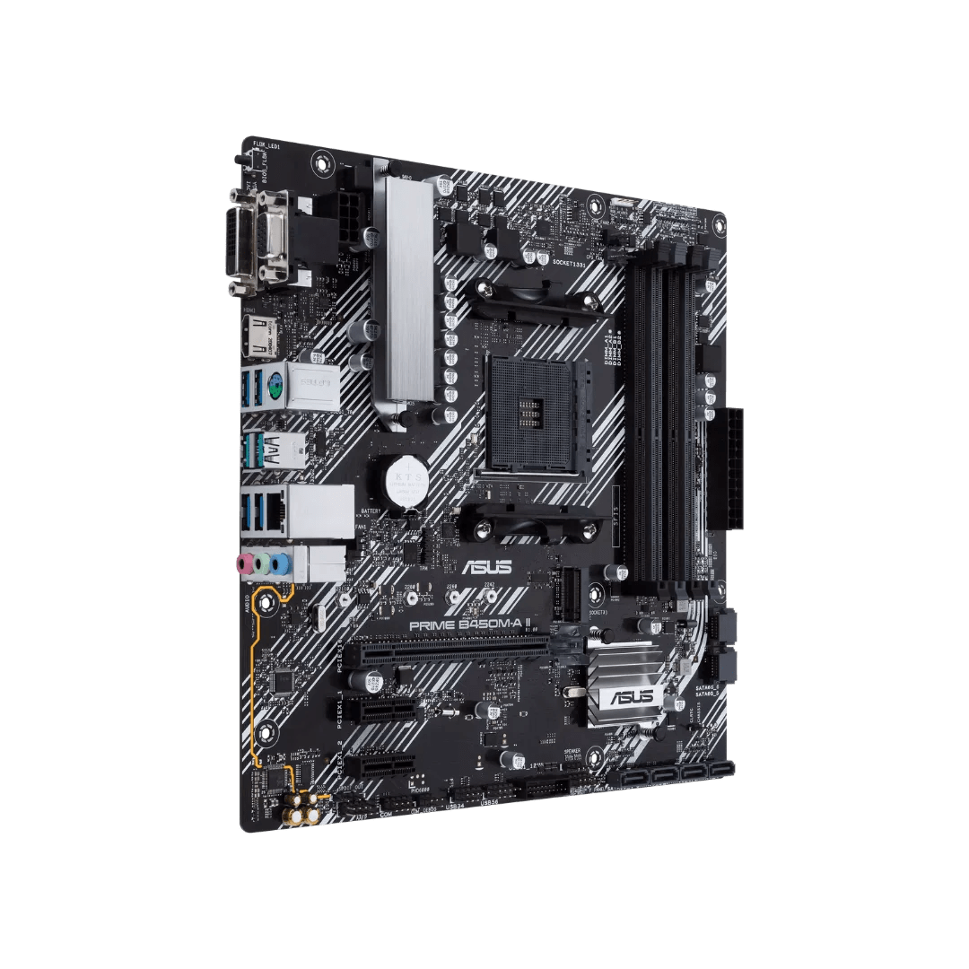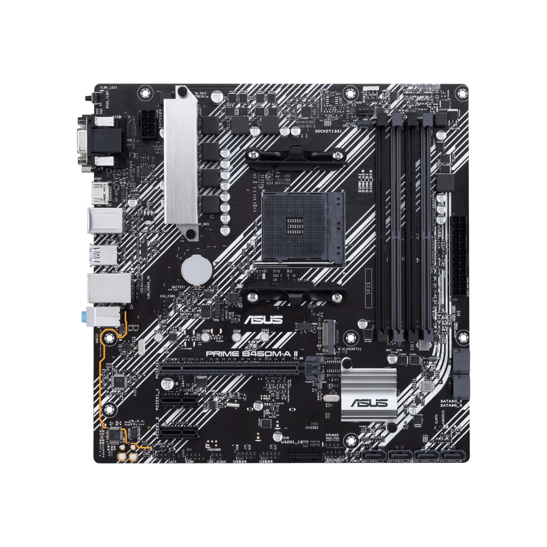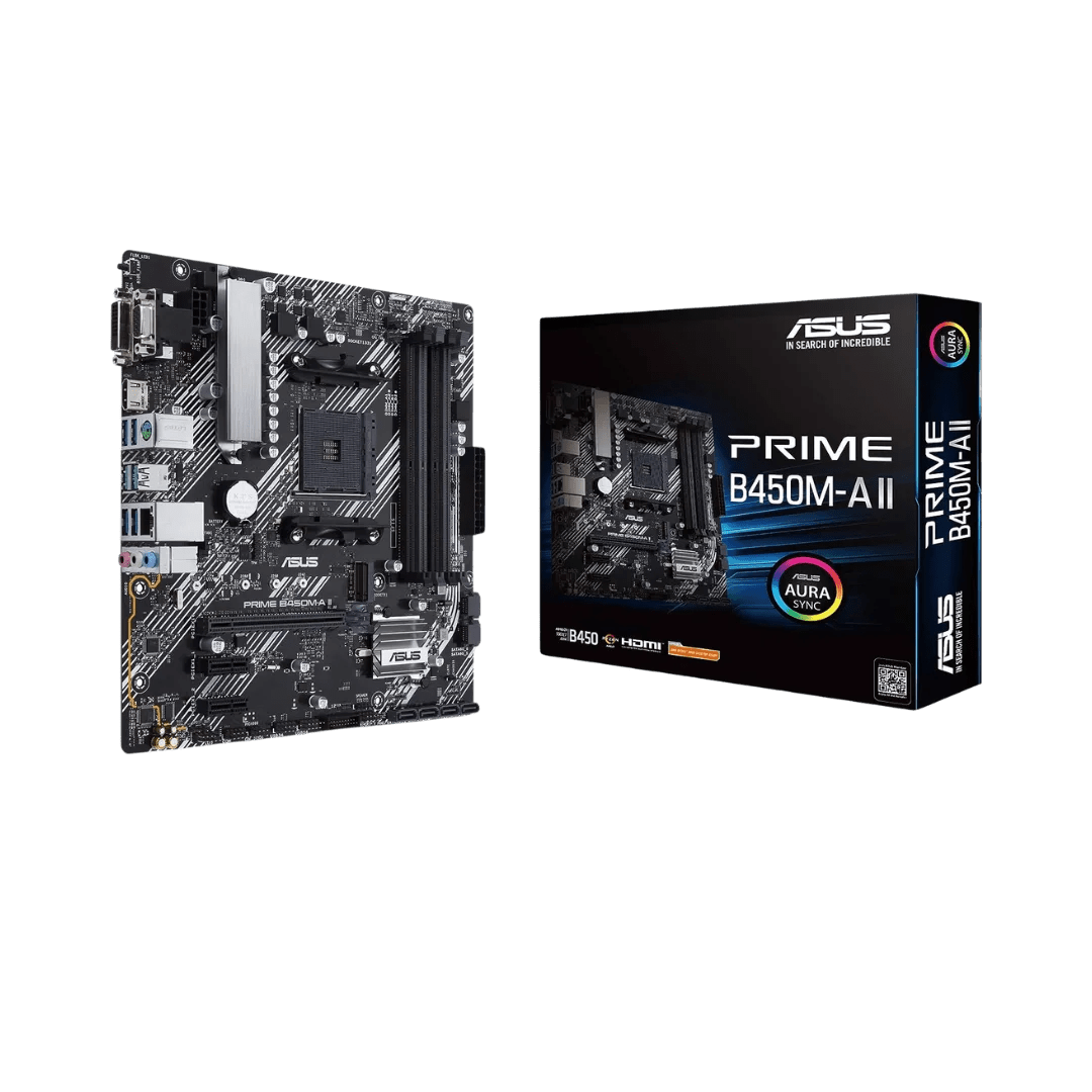 The ASUS Prime B450M-A II motherboard is a compact, reliable solution for AMD Ryzen 5000, 4000, and 3000 series processors. With features like PCIe 3.0, M.2 support, and USB 3.2, it ensures fast performance and seamless connectivity. Built with ASUS 5X Protection III for durability and Aura Sync RGB for a stylish touch, it’s perfect for space-saving builds.
