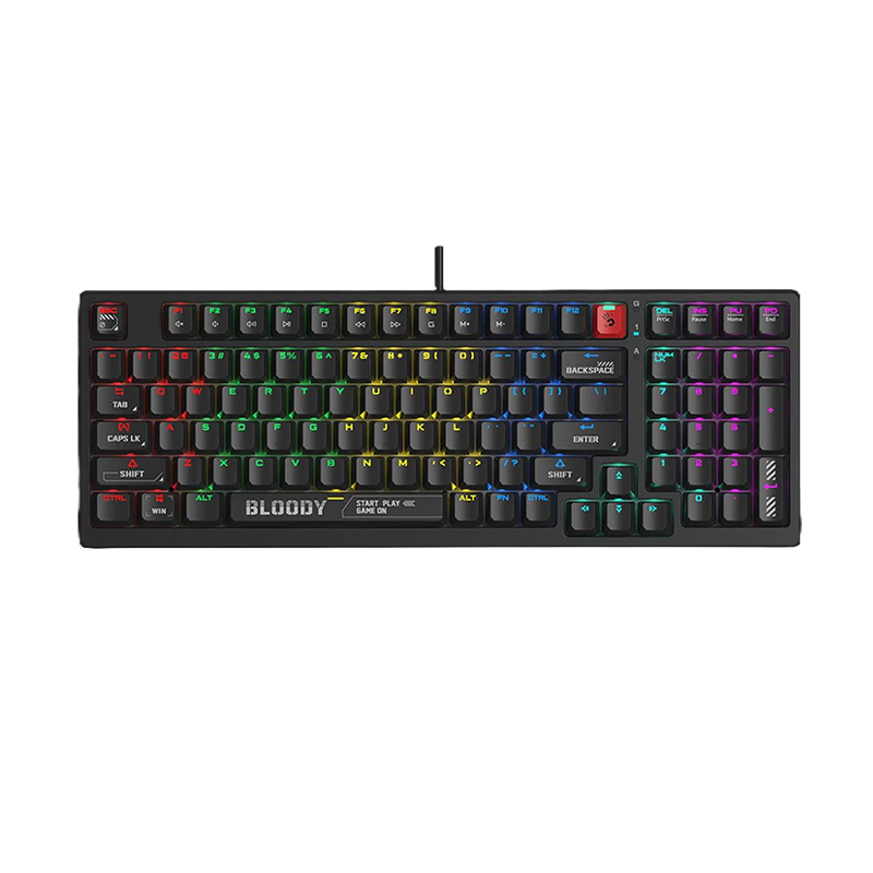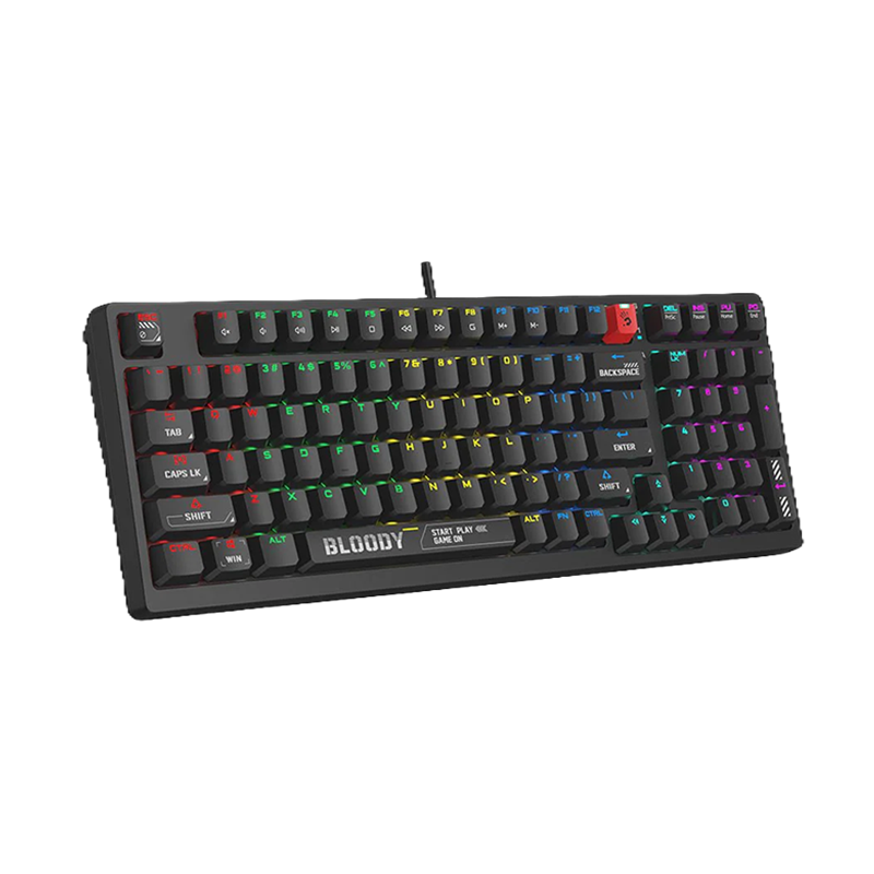 This Bloody mechanical gaming keyboard supports hot‑swappable 3‑Pin & 5‑Pin switches, allowing you to upgrade or personalize your switch feel without soldering. Its 98‑key compact layout maximizes desk space while retaining essential key functions.